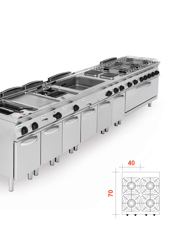 With versatile modularity (700mm depth and 40mm width), TECNO74 is ideal for installation in medium-sized restaurants, self-service establishments, small hotels and cafeterias, and can also be used with the TECNO90 line to increase the productivity of kitchens which serve a greater number of people but have limited available space.
